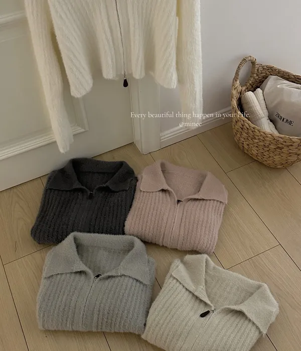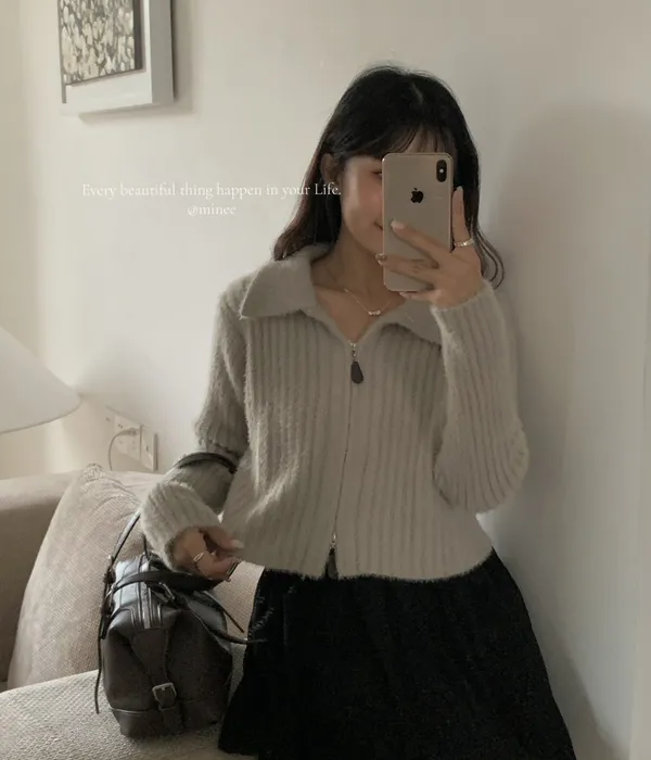 水貂毛系列-雙拉鍊微短版翻領上衣